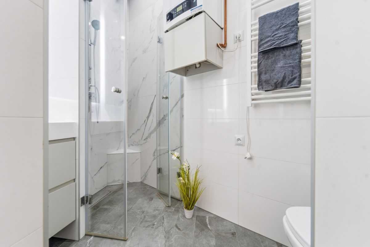 W centralnej części mieszkania znajduje się kominek z rozprowadzeniem ciepła, który nie tylko tworzy przytulną atmosferę, ale również wspomaga ogrzewanie wnętrza. Ogrzewanie i ciepła woda pochodzą z nowoczesnego pieca gazowego dwufunkcyjnego z 2015 roku, a gruntowny remont wykonany w 2020 roku objął wymianę instalacji elektrycznej oraz wodno-kanalizacyjnej, a także pionów, co gwarantuje wygodę i bezpieczeństwo użytkowania.
