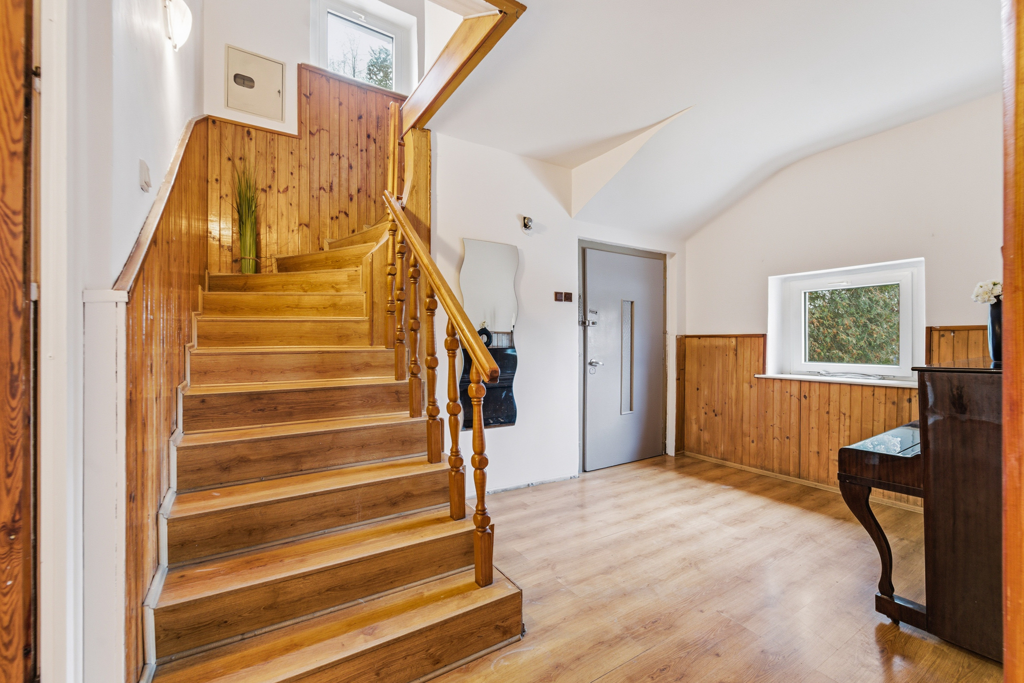 Na piętro prowadzą klasyczne, drewniane schody, nadające wnętrzu charakteru.