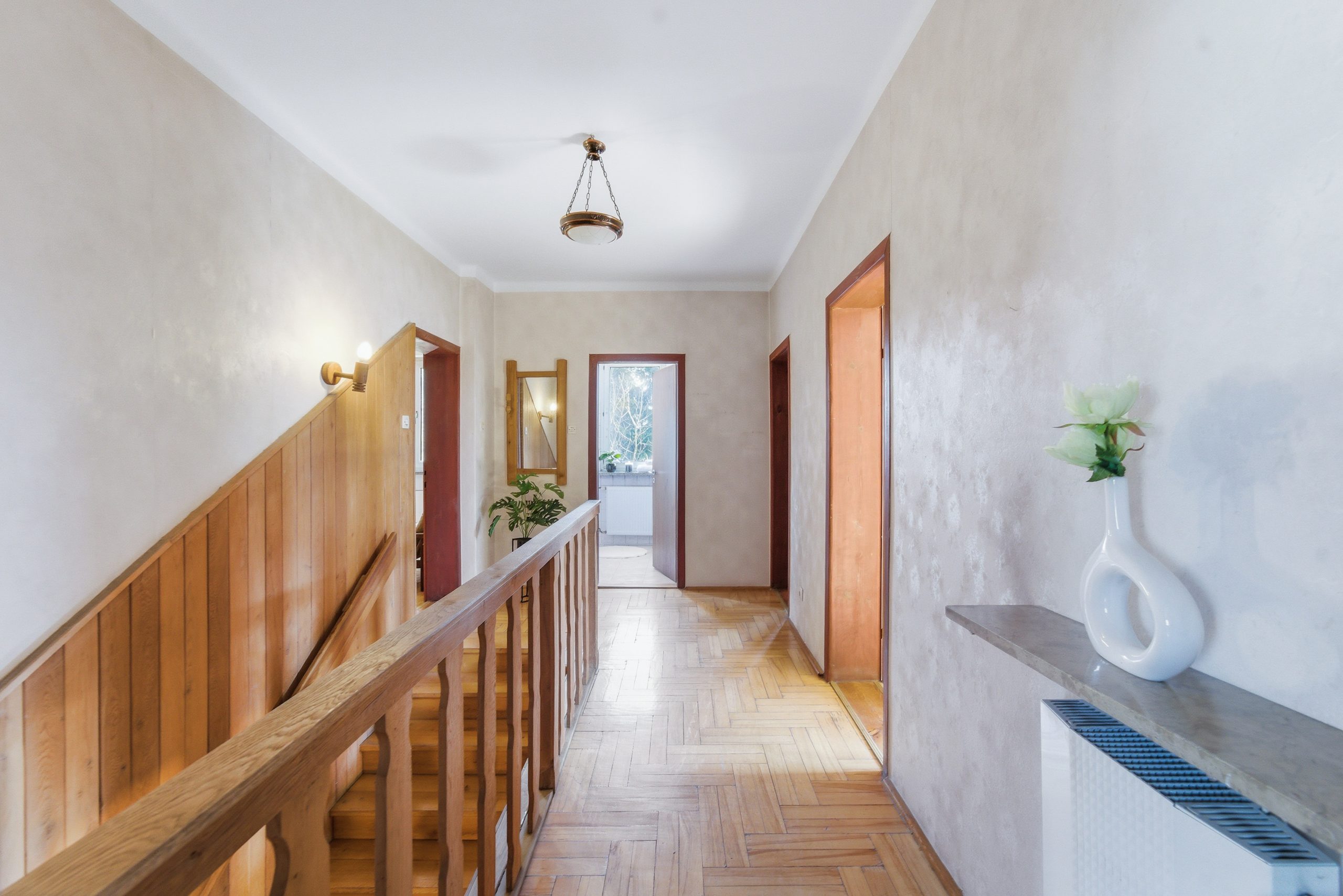 Na piętrze znajdują się cztery ustawne pokoje oraz łazienka z wanną – idealna przestrzeń dla rodziny lub do wydzielenia stref prywatnych.