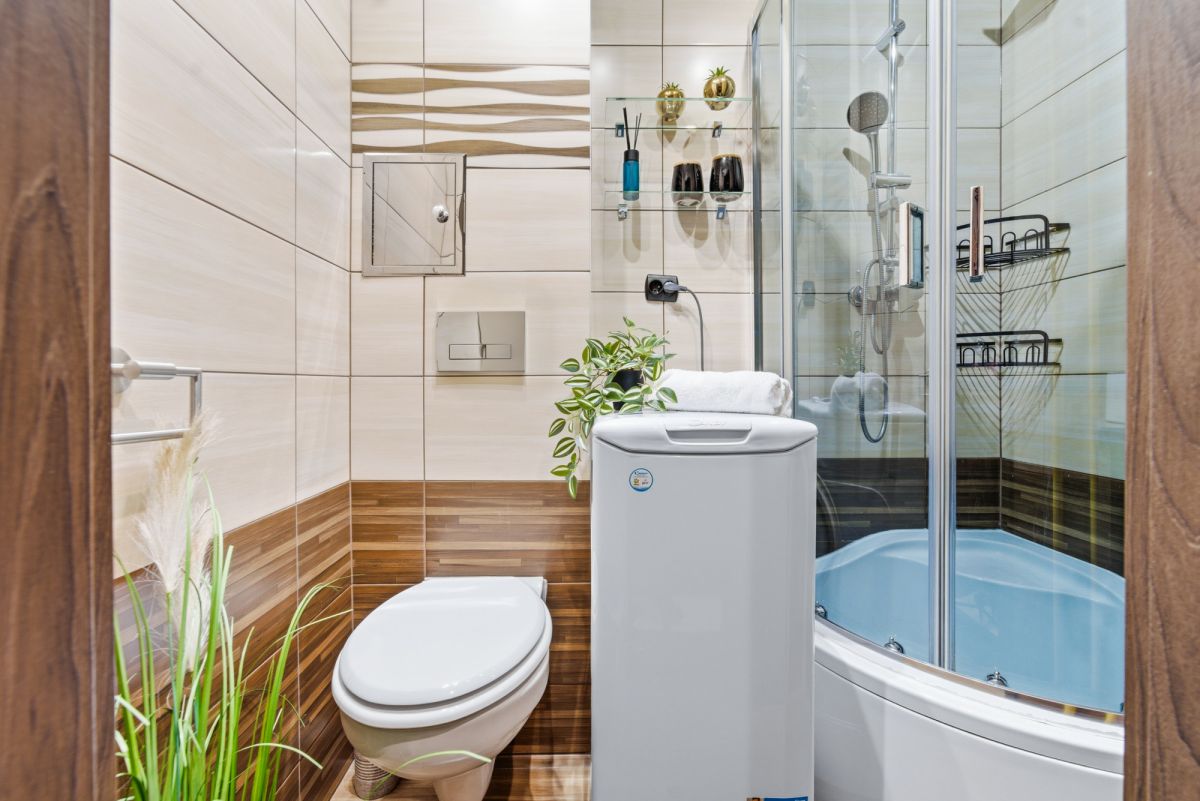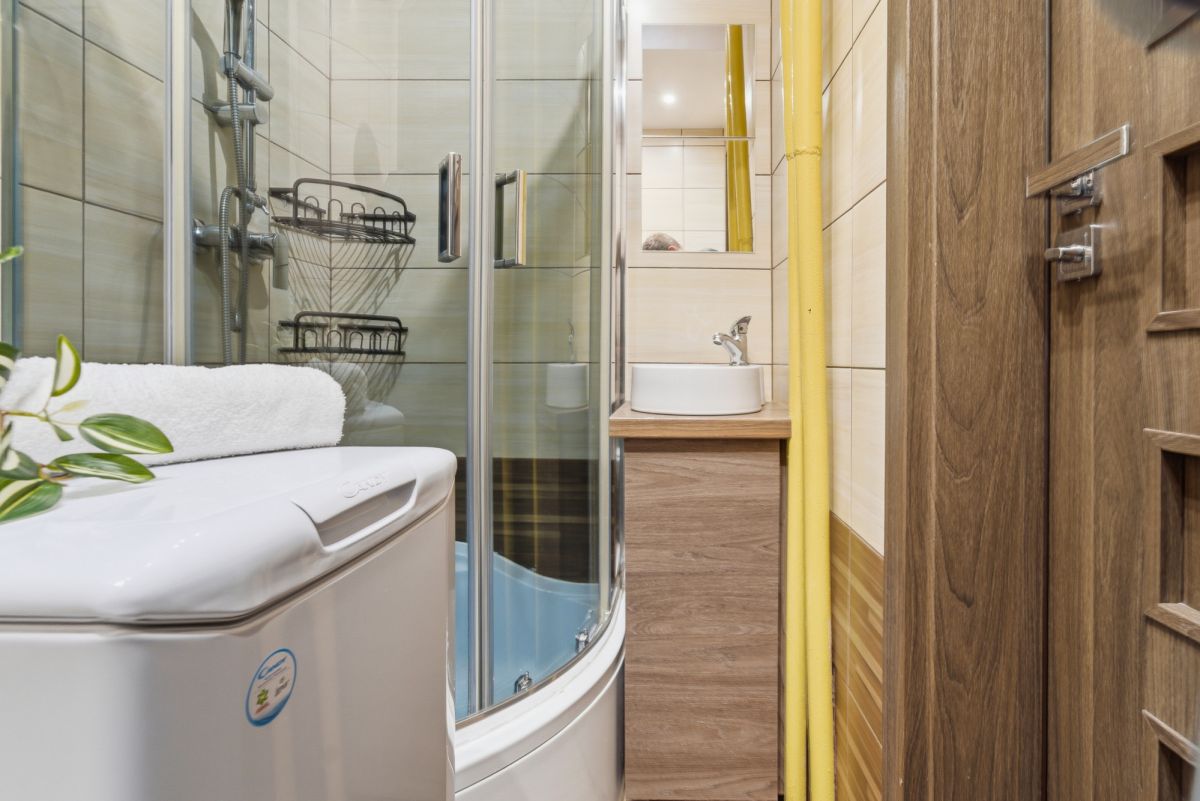 W łazience pozostaje także pralka. Woda ciepła z piecyka gazowego.