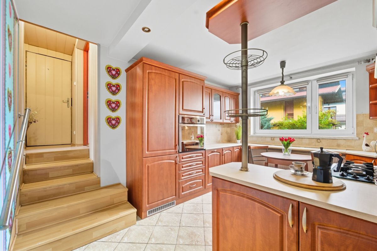 Duża kuchnia w zabudowie, wyposażona w sprzęty AGD, stanowi serce domu i zachęca do wspólnego spędzania czasu przy rodzinnym stole. Zaznaczam jednak, że narożnik oraz stół z sześcioma krzesłami nie są częścią sprzedaży - pozostałe elementy widoczne na zdjęciach są częścią oferty.